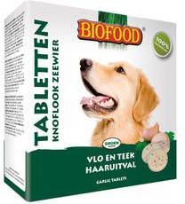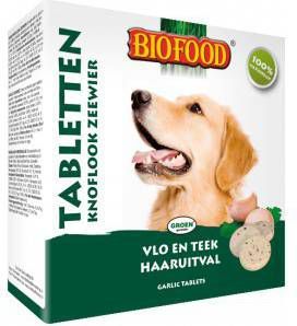 Biofood Knoflook En Zeewier GisttablettenDe smaakvolle en gezonde gisttabletten voor honden van alle leeftijden met zeewier, knoflook, aminozuren, vitaminen (A, B, D en E) en mineralen. * Glutenvrij * Voorkomt vlooien en teken * Voor alle hondenrassen, van alle leeftijdenBiofood gisttabletten met knoflook en zeewier bevatten de volgende vitamines: * Vitamine A ondersteunt huid, gezichtsvermogen, afweer- en immuunsysteem * Vitamine B voorkomt vermoeidheid, moeheid en ondersteunt het immuunsysteem * Vitamine D ondersteunt botten, werking van de spieren, tanden, immuunsysteem * Vitamine E ondersteunt bloedcellen, bloedbaan, weefsel, weerstand en stofwisseling.
