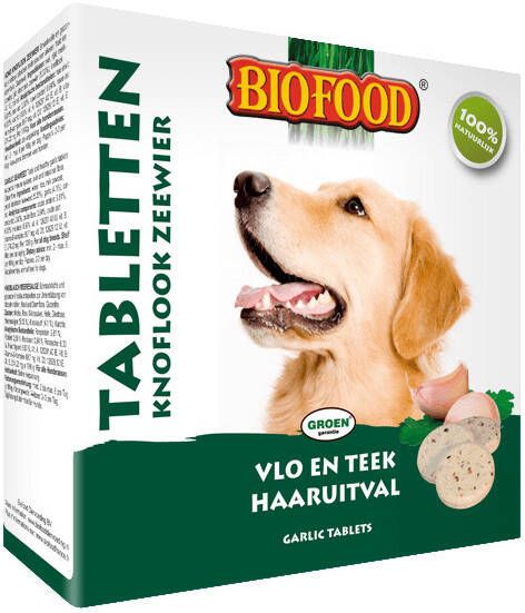 Biofood Knoflook En Zeewier Gisttabletten De smaakvolle en gezonde gisttabletten voor honden van alle leeftijden met zeewier, knoflook, aminozuren, vitaminen (A, B, D en E) en mineralen. Voorkomt bij dagelijks gebruik vlooien en teken. * Glutenvrij * Voorkomt vlooien en teken * Voor alle hondenrassen, van alle leeftijdenBiofood gisttabletten met knoflook en zeewier bevatten de volgende vitamines: * Vitamine A ondersteunt huid, gezichtsvermogen, afweer- en immuunsysteem * Vitamine B voorkomt vermoeidheid, moeheid en ondersteunt het immuunsysteem * Vitamine D ondersteunt botten, werking van de spieren, tanden, immuunsysteem * Vitamine E ondersteunt bloedcellen, bloedbaan, weefsel, weerstand en stofwisseling.