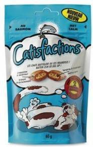 Catisfactions Kattensnoepjes Zalm 60 grCatisfactions bevatten minder dan 2 Kcal per stuk en kunnen op ieder moment van de dag gegeven worden. Advies is om je kat tot 20 Catisfactions brokjes per dag te geven. Je kat krijgt dan 8,4% van zijn dagelijkse behoefte aan kilocalorieën binnen. Zorg ook dat er altijd vers drinkwater in de buurt is. * Krokante binnenkant * Zachte kern * Met zalm smaak.