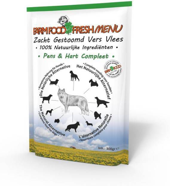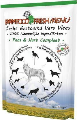 Farmfood Fresh Menu Pens En Hart CompleetFarmfood Fresh Menu is een natuurlijke, gezonde en smakelijke complete maaltijd voor jouw hond. Het is de perfecte voeding welke buiten de koelkast houdbaar is. Een ideaal alternatief voor verse diepvries voeding voor honden. Het Farmfood Fresh Menu is zachtgestoomd vers vlees, geschikt voor alle honden van alle leeftijden. De dierlijke ingrediënten komen van dieren die voor menselijke consumptie zijn goedgekeurd. De complete voeding bevat geen kip of ander pluimvee, het is glutenvrij en het bevat geen gemalen bot. De voeding heeft hierdoor een gegarandeerd gecontroleerd gehalte aan calcium en fosfor en wordt optimaal opgenomen in de darmen. * Complete voeding houdbaar buiten de koelkast * Alleen pure en natuurlijke ingrediënten * Zonder kunstmatige additieven zoals chemische antioxidanten, conserveermiddelen, bindmiddelen, kleur-, geur- en smaakstoffen * Farm Food Fresh Menu is een goede bron van natuurlijke prebiotica vooreen gezonde en stabiele darmflora * Heel smakelijk, ook voor lastige eters en optimaal te verteren * Goed te mengen met Farmfood droogvoer * Ideaal om mee te nemen op vakantie.