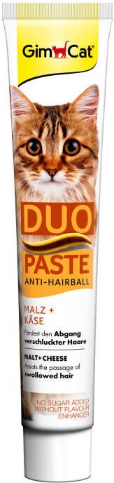 Soms kan je kat wel een steuntje in de rug gebruiken. Met de Duo-Paste Anti-Hairball van GimCat voorzie je je kat van een verkwikkende beloning. De pasta bevat onder andere zuiver aromatische mout, oliën, vezels en heerlijke kaas, de combinatie van deze ingrediënten bevordert de natuurlijke afvoer van ingeslikt haar.