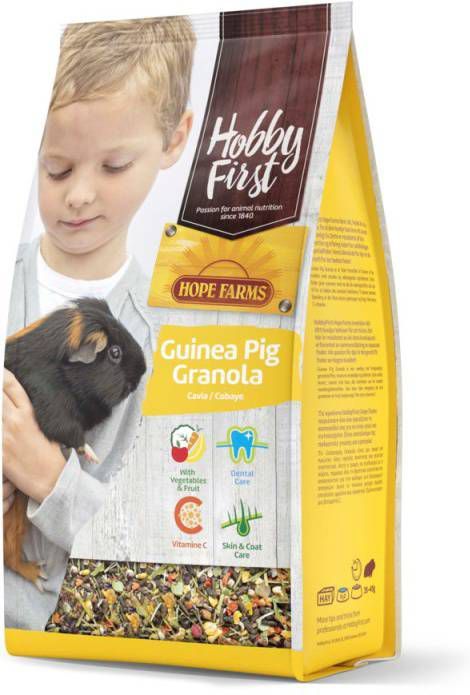 Hobby First Hope Farms Cavia GranolaHobby First Hope Farms cavia granola is een voeding met hoogwaardige grondstoffen, mooie en smakelijke ingrediënten. Deze voeding levert, samen met hooi, alle nutriënten van de complete voedingsbehoeften. Aan deze rijke mengeling zijn extra groenten en fruit toegevoegd. Daarnaast bevat dit caviavoer extra vitamine C om het natuurlijk tekort aan vitamine C dat cavia’s hebben te compenseren. Hierdoor blijft je cavia gezond en vitaal. * Gemengd voer voor cavia's * Met vitamine c * Met groente en fruit * Verzorgt het gebit.