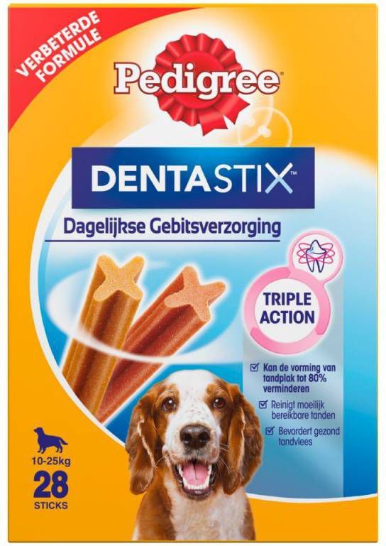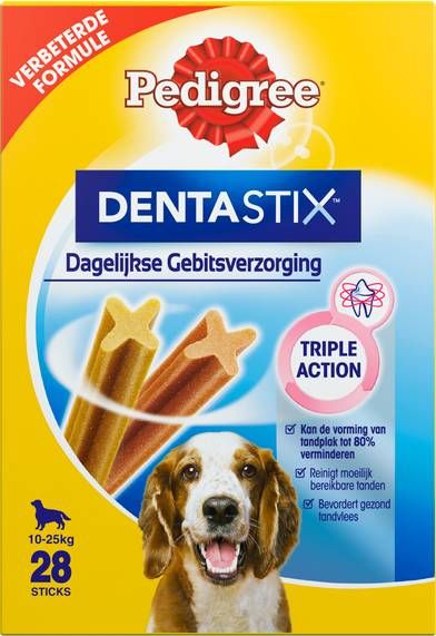 Pedigree Dentastix Multipack MediumDe Dentastix Medium van Pedigree zijn geschikt voor volwassen honden van gemiddelde grootte, en hebben een reinigende werking op het gebit. De x-vorm verwijdert vuil aan de oppervlakte en de ingredinten maken tandplak onschadelijk. Bij dagelijks gebruik helpt het de vorming van tandplak tot 80% te verminderen. Alleen geschikt voor honden tussen de 10 kg en 25 kg. Niet geschikt voor puppys jonger dan 4 maanden. * Voor volwassen honden van 10 kg tot 25 kg * Draagt bij aan de vermindering van tandsteen * Dentastix zijn suikervrij en vetarm * Zonder kunstmatige kleur- en smaakstoffen.