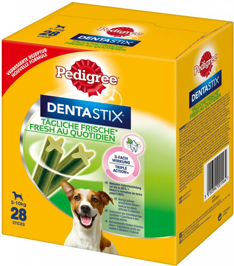 De dagelijkse verzorging van het gebit is bij honden heel belangrijk. Pedigree Dentastix Fresh ondersteunt het behoud van gezonde tanden en tandvlees. De combinatie van Eucalyptus en groene thee-extracten vermindert de slechte adem die wordt veroorzaakt door VSC-bacteriën en zorgt voor een frisse adem. Wetenschappelijk bewezen kunnen de Pedigree Dentastix Fresh bij dagelijks voeren de vorming van tandsteen tot 80% verminderen, dankzij de combinatie van de speciale textuur en reinigende actief werkende stoffen. Pedigree Dentastix Fresh is volledige verteerbaar en er blijft niets van over. Honden houden van de Dentastix Fresh en zullen er alles voor doen! Pedigree Dentastix Fresh: Unieke X-vorm Combinatie van speciale textuur actief werkende stoffen Eucalyptus en groene thee-extracten voor frisse adem Kan bij dagelijks voeren de vorming van tandsteen tot 80% verminderen (wetenschappelijk bewezen) Tandverzorging met een bite Passende Stix-grootte voor iedere hond Als multi- en voordeelpakket verkrijgbaar Pedigree Dentastix Fresh is de gemakkelijke oplossing om de tanden van uw hond gezond en krachtig te houden en zorgen ook voor een frisse adem. Pedigree Dentastix Fresh verzorgen het gebit van uw hond heel gemakkelijk tijdens het kauwen. Maak uw keuze tussen de verschillende verpakkingen: 7 stuks (totaal 110 g) voor jonge kleine honden 7 stuks (totaal 180 g) voor middelgrote honden 7 stuks (totaal 270 g) voor grote honden 28 stuks (totaal 440 g) voor jonge kleine honden 28 stuks (totaal 720 g) voor middelgrote honden 28 stuks (totaal 1080 g) voor grote honden.