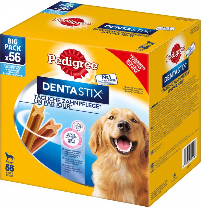 Pedigree DentaStix heeft een unieke x-vorm die om de tanden van de hond heen valt en deze zo reinigt. Wanneer dit dagelijks gevoerd wordt, kan het de opbouw van tandsteen tot wel 80% verminderen.