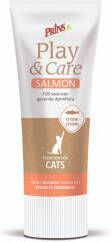 Play & Care Salmon bevat maar liefst 35% verse zalm en 10% zalmolie, deze zalm is de enige dierlijke eiwitbron in de paté. Er is FOS (fructo-oligosaccharide) toegevoegd ter ondersteuning van een gezonde darmflora. De tube bevat als extra ingrediënt taurine, een essentieel aminozuur dat een belangrijke bouwsteen voor het lichaam vormt bij katten. Alle nuttige ingrediënten in deze snack zijn een bron van eiwit, vetzuren, mineralen, vitaminen en vezels.