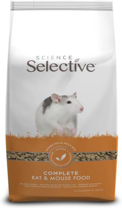 Supreme Science Selective Rat&MouseSupreme Science Selective Rat is een complete, smakelijke en vegetarische rattenvoeding. Door de toegevoegde soja is de voeding rijk aan eiwitten, maar arm aan verzadigde vetzuren en cholesterol. De mix is gebaseerd op appel en zwarte bes en zit vol vitaminen en antioxidanten. De uniforme brokken voorkomen het selectief eten en zorgen ervoor dat ratten alle voedingstoffen die ze nodig hebben ook binnenkrijgen. De stevige en vezelrijke brokken bevorderen de spijsvertering en de gezondheid van het gebit. * Uniek vegetarisch recept– zonder afbreuk te doen aan de voedingswaarde * Voorkomt selectief eten * Bevordert de gezondheid van het gebit * Bevat appel en zwarte bes (antioxidanten en vitaminen) * Rijk aan meervoudig onverzadigde vetzuren * Laag gehalte verzadigde vetzuren en cholesterol * Soja eiwitten (hoge kwaliteit eiwitten voor een gezond leven) * Zeer smakelijk * Zonder toegevoegde suikers * Zonder toegevoegde kleurstoffen * Mono-component, volledig geëxtrudeerd dieet.