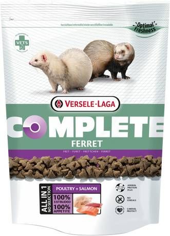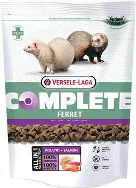 Een uniek concept op de dierenmarkt is het 'All-in-one' brokje. De Complete Ferret van Versele-Laga is een 'All-in-one' brokje. Deze bijzonder smakelijke korrel voorkomt selectief eetgedrag. Door het aanbieden van een 'All-in-one' brok zorg je ervoor dat jouw fret alle essentiële voedingsstoffen binnenkrijgt. Deze graan- en glutenvrije bevat 90% eiwit van dierlijke afkomst. Dit zorgt voor een optimale vertering en draagt bij aan een goede conditie. Aan de voeding is 40% taurinerijke dierlijke eiwitten toegevoegd om zorg te dragen voor een goede werking van de hartspier. Versele-Laga Complete Ferret is ontwikkeld door dierenartsen en gebaseerd op wetenschappelijke inzichten.