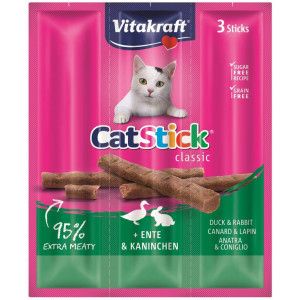 Vitakraft Catstick Classic eend & konijn kattensnoep zijn heerlijke snoepsticks, verpakt per 3 sticks, die breed gewaardeerd worden door alle soorten katten.
