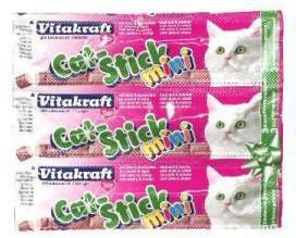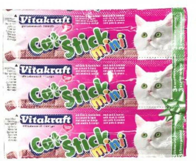 Cat-Stick Mini van Vitakraft is verpakt per 3 stuks in de smaken eend-konijn, gevogelte-lever, kabeljauw-tonijn, kalkoen-lam, kip, schol-omega 3 en zalm