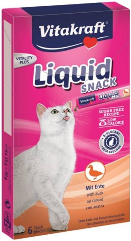 Vitakraft Cat Liquid Snack Eend is een vloeibare snack op basis van eend en bèta-glucanen, die bovendien bijdraagt aan de weerstand van je kat.